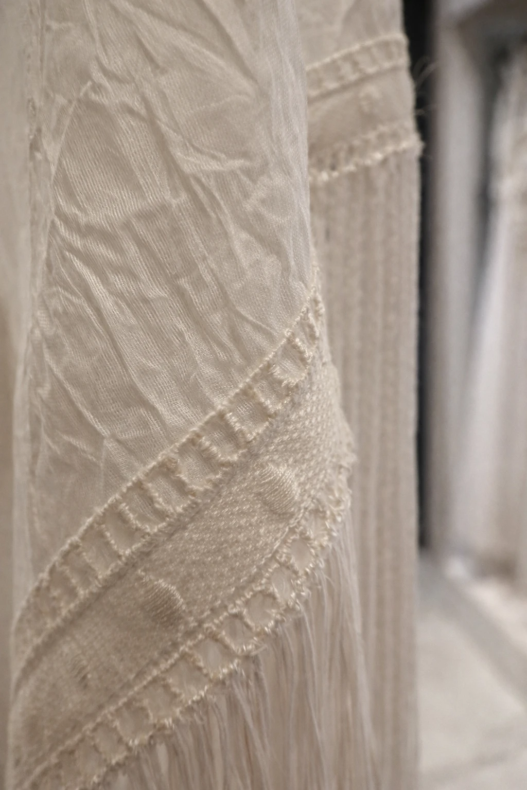El diseño se construye a partir de un entredós de hilo, trabajado artesanalmente, del cual nacen flecos colocados uno a uno, generando caída, ritmo y movimiento.