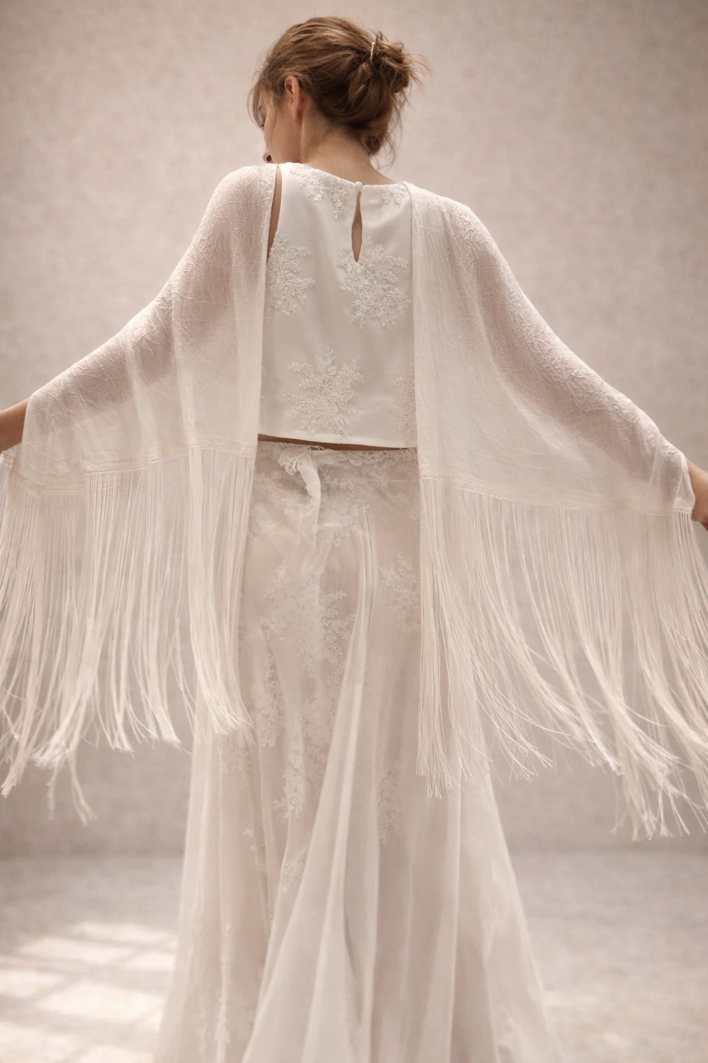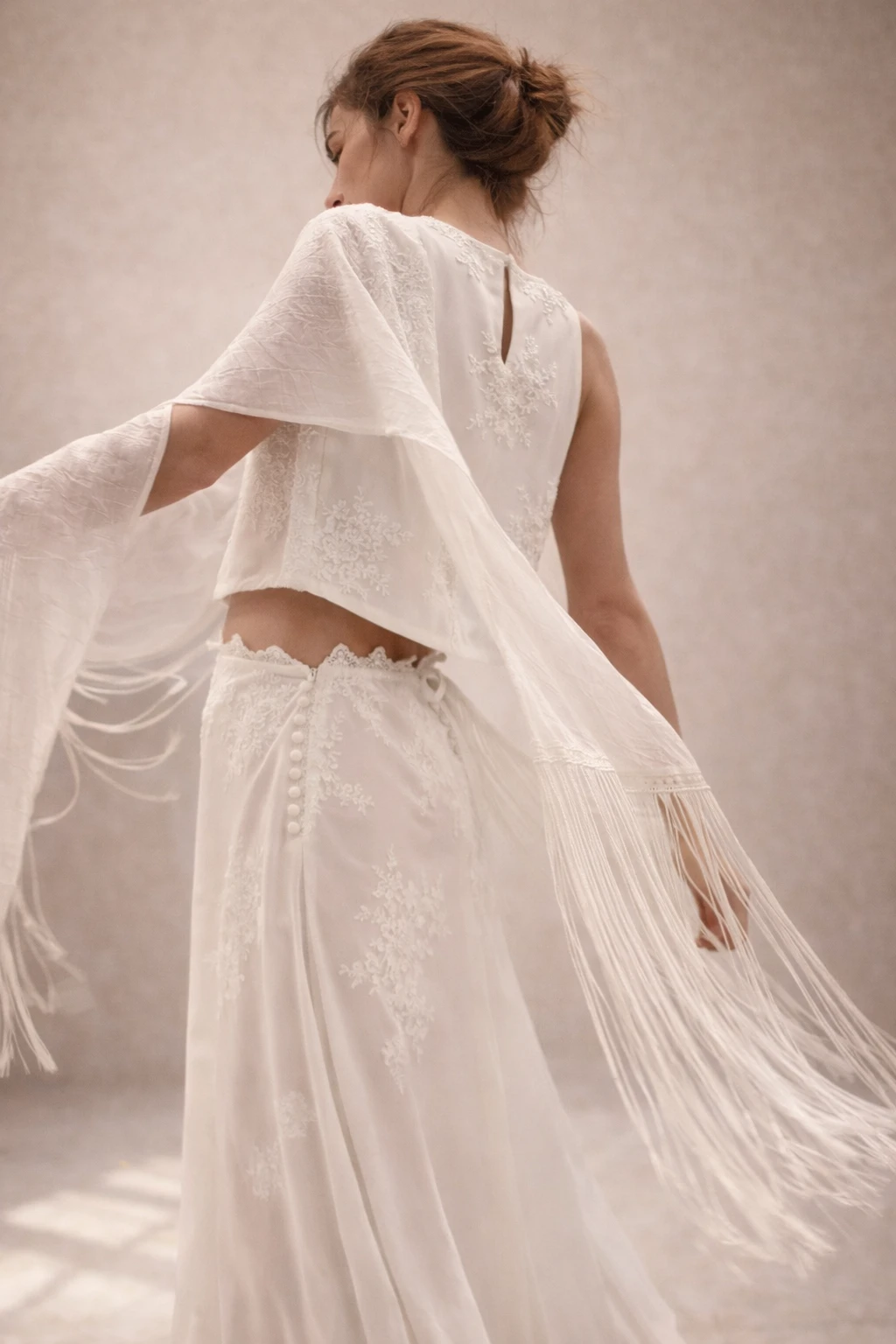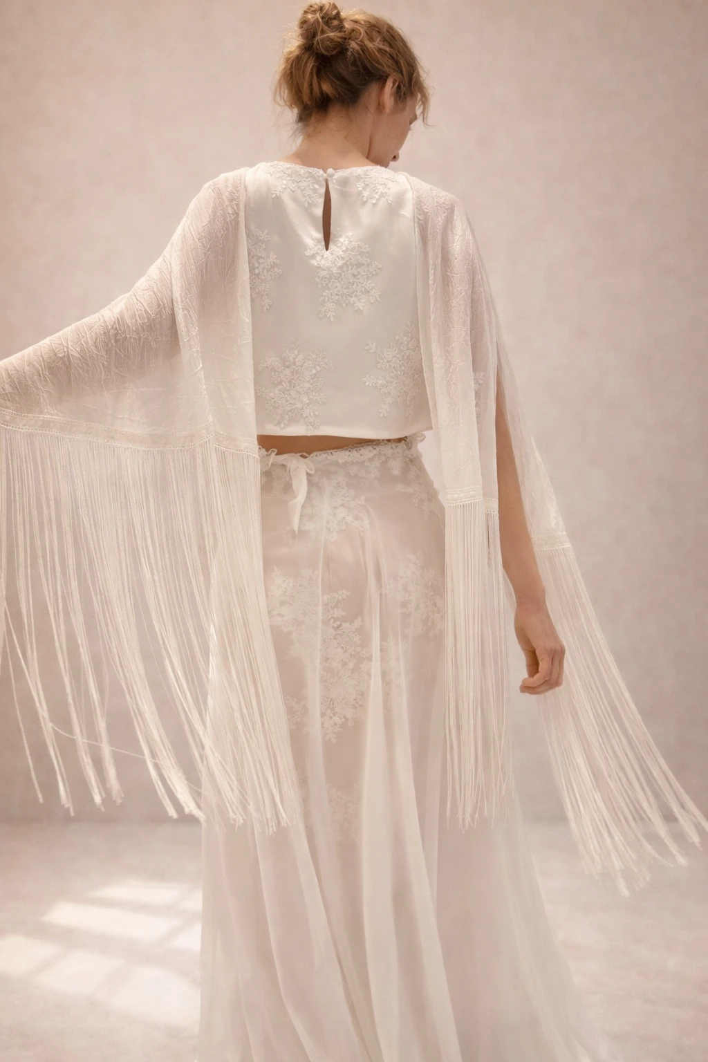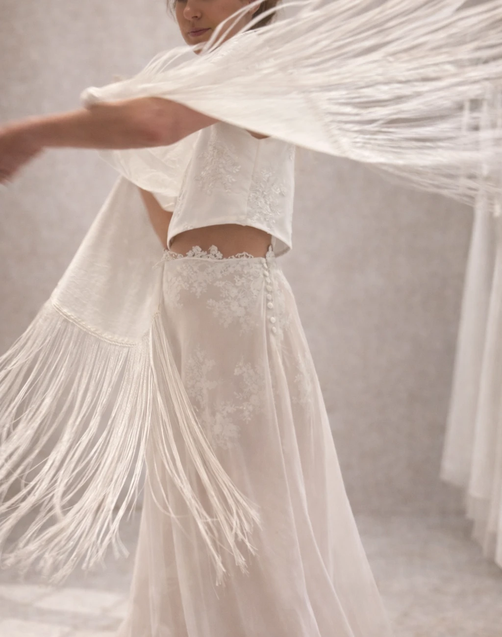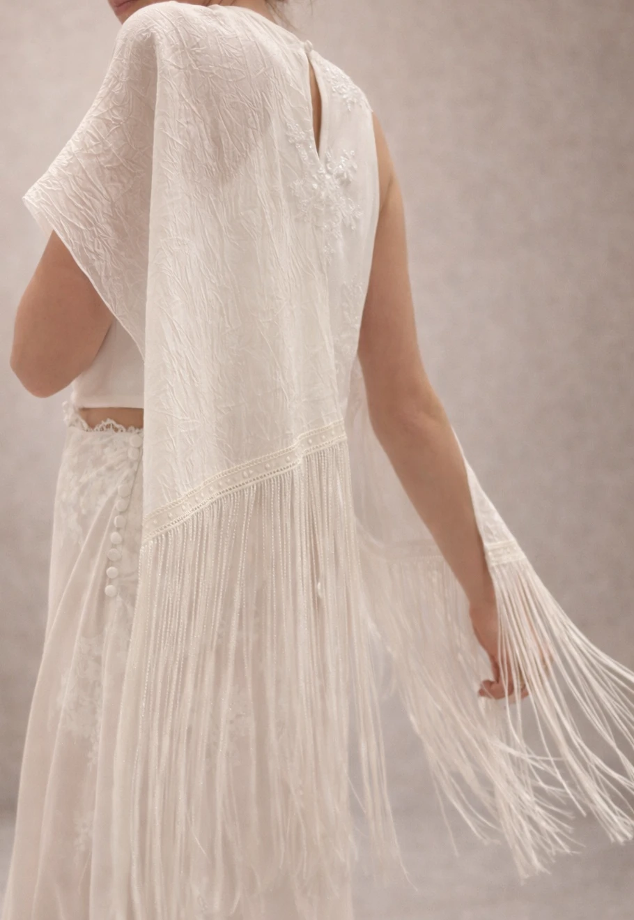Los flecos, largos y etéreos, se desplazan con el cuerpo, sumando ligereza y un gesto delicado a la silueta.