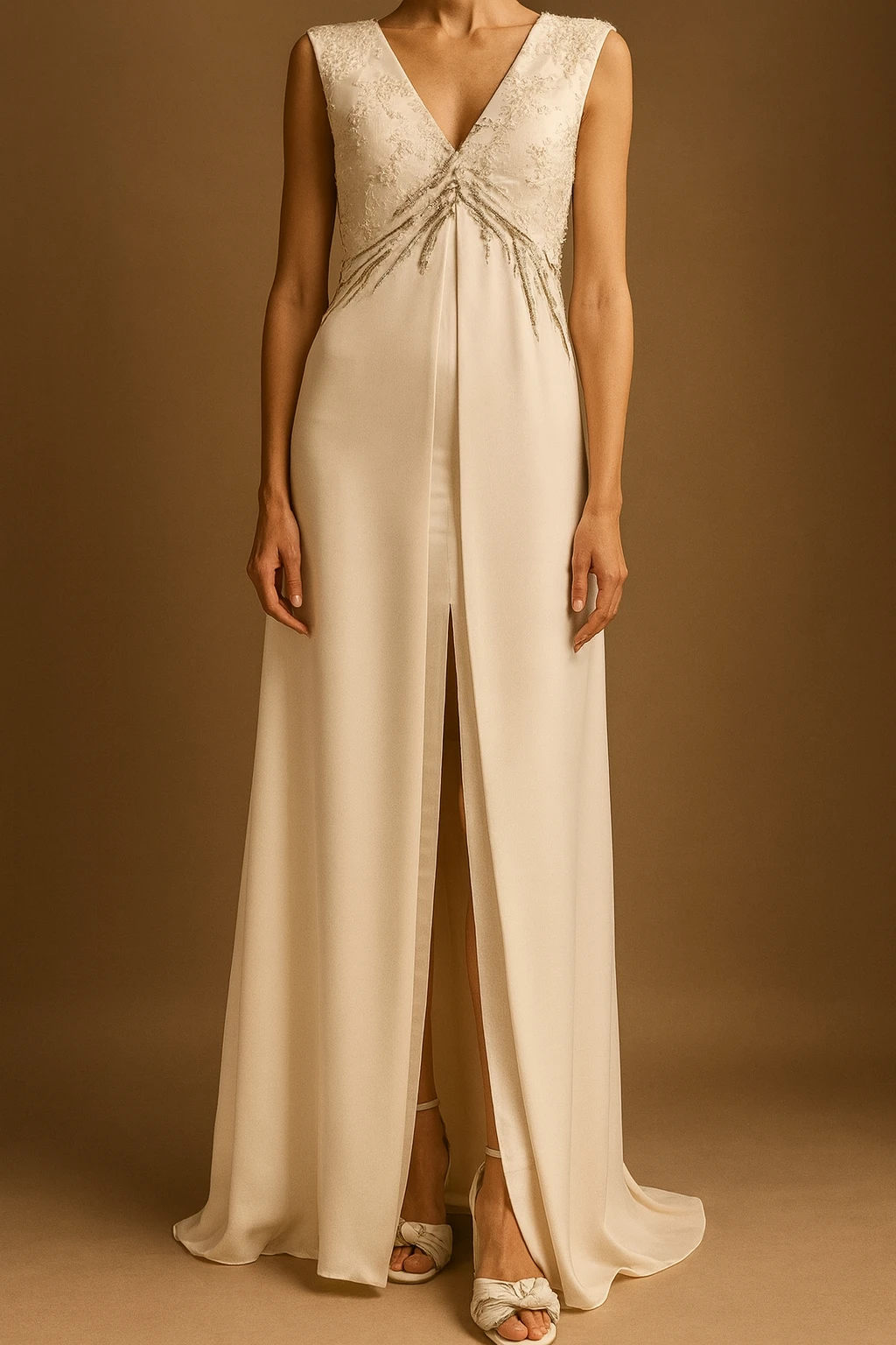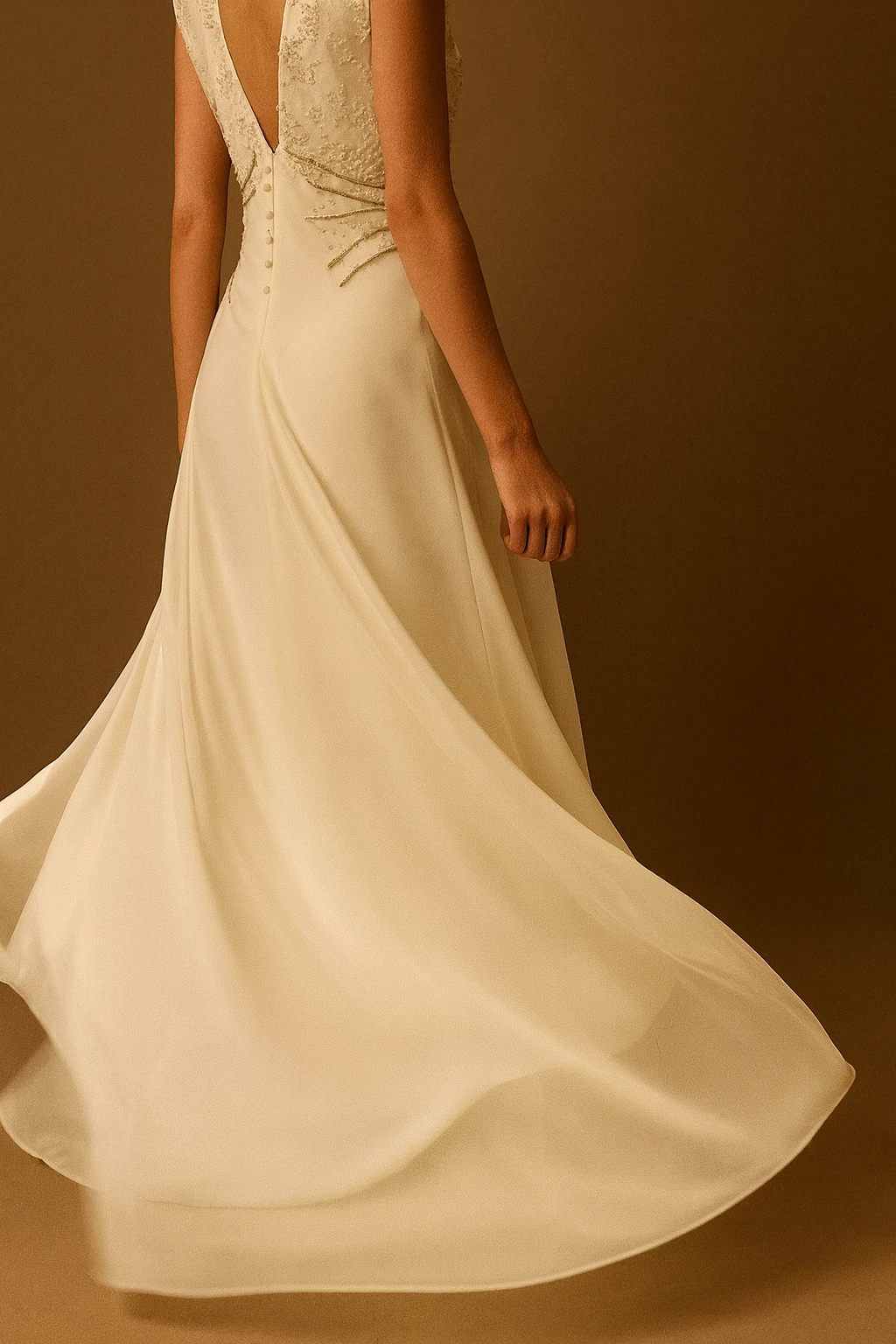 El Vestido Concepción está confeccionado en saten opaco de caída liviana y suave brillo natural. Escote profundo en V en delantero y espalda.