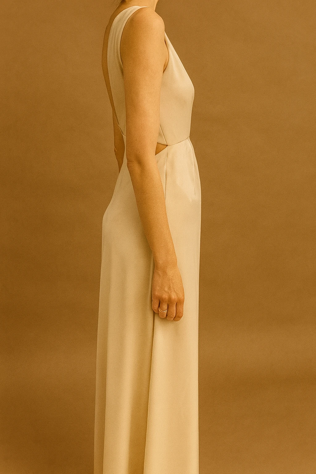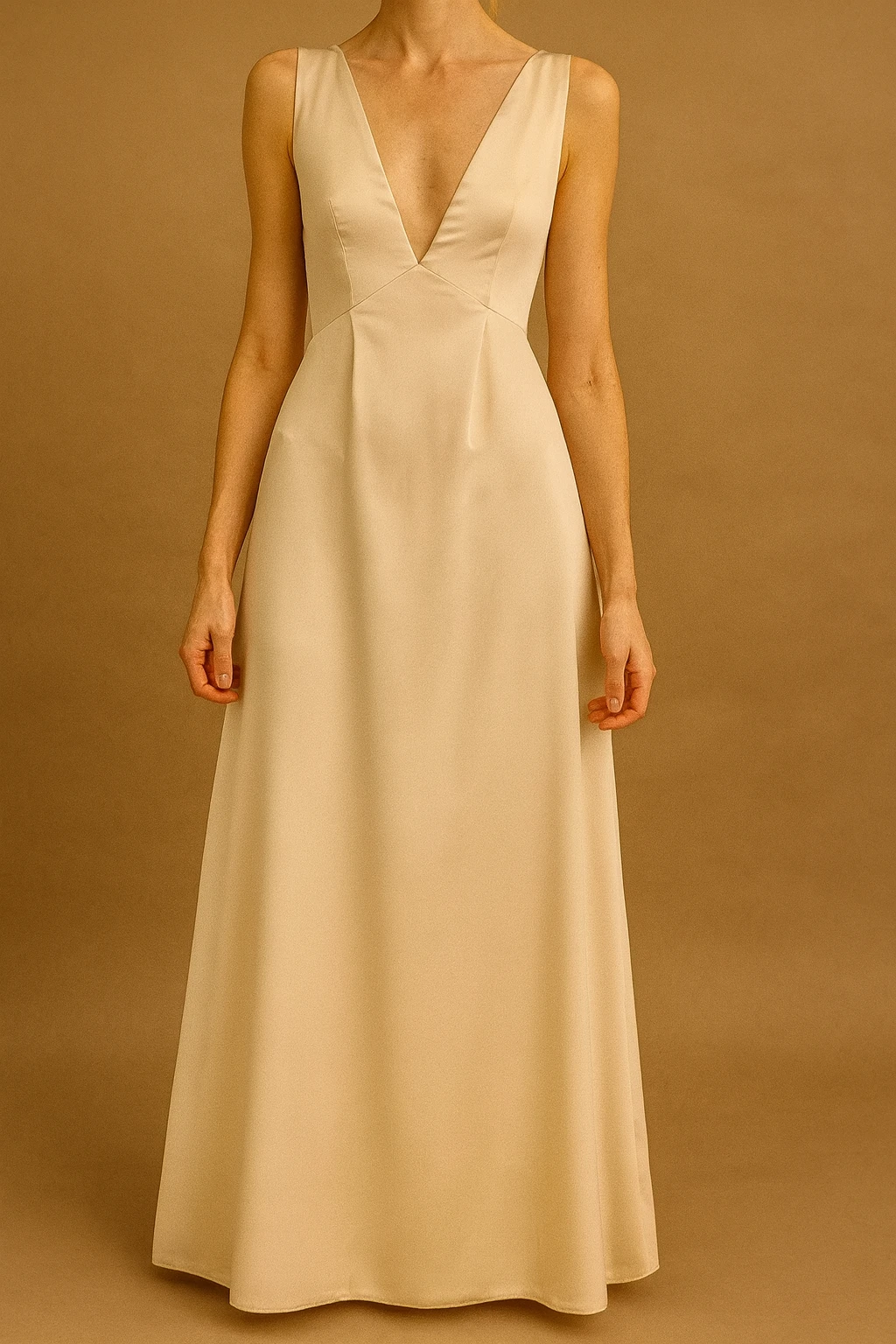 Confeccionado en satinado color rosa empolvado suave, su caída acompaña la silueta con un movimiento fluido y elegante.