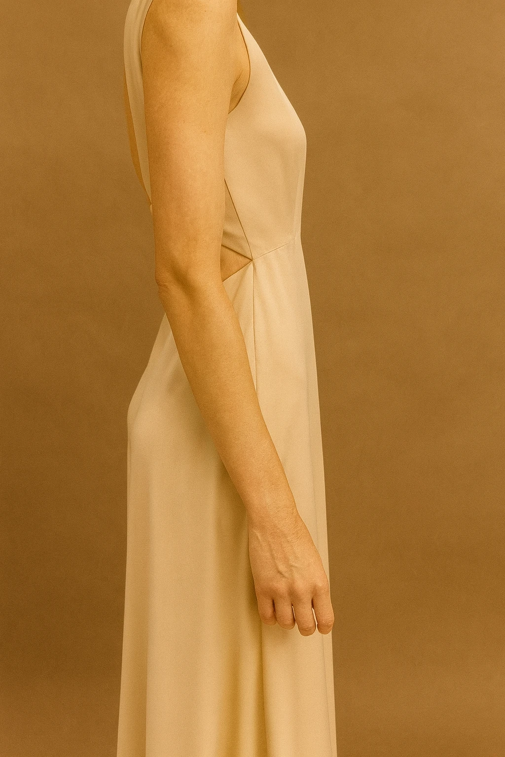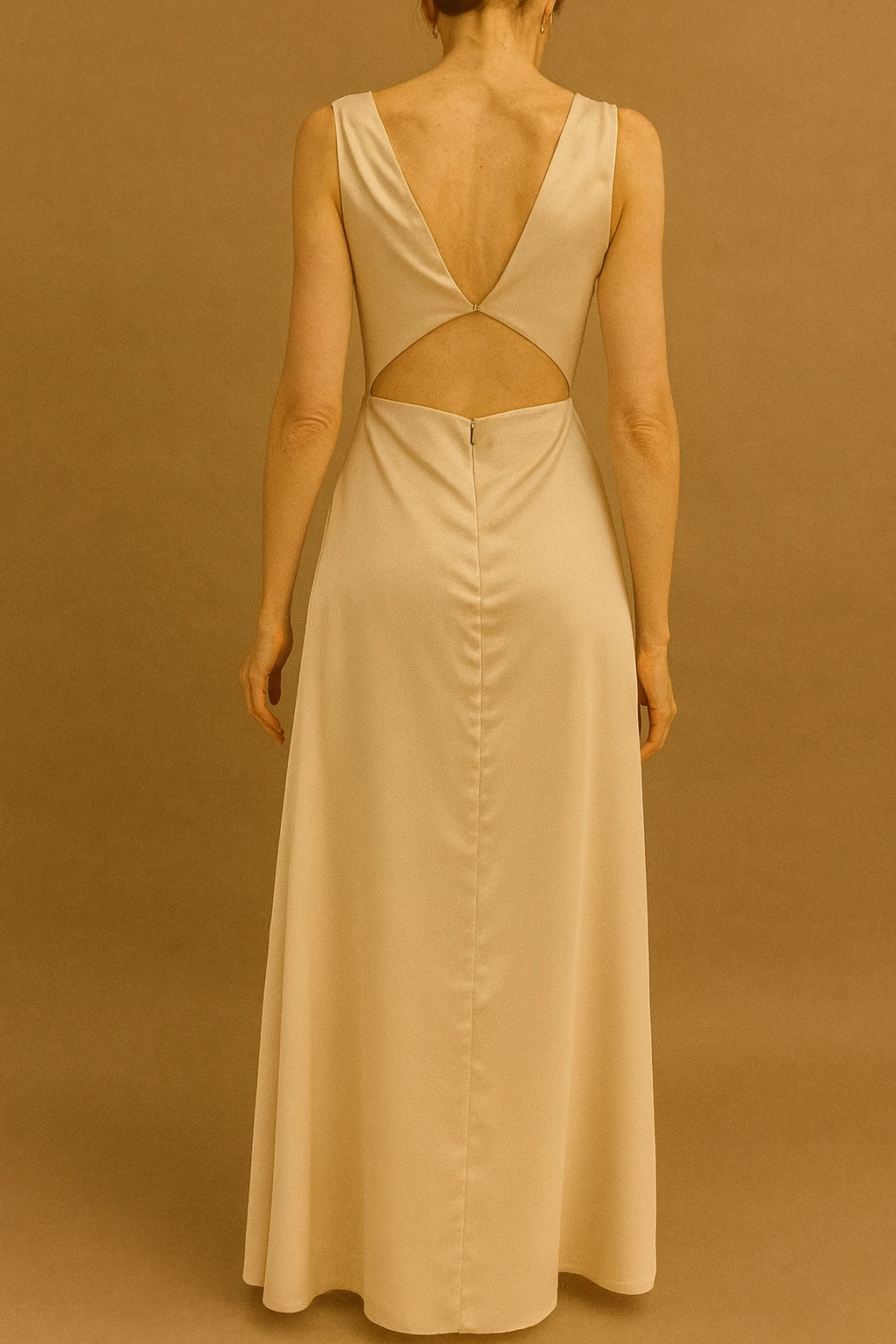 El diseño se distingue por su escote en V profundo que estiliza el frente y una espalda escotada con recorte geométrico, aportando un toque inesperado y moderno. La falda evase alarga la figura y crea una caída natural.