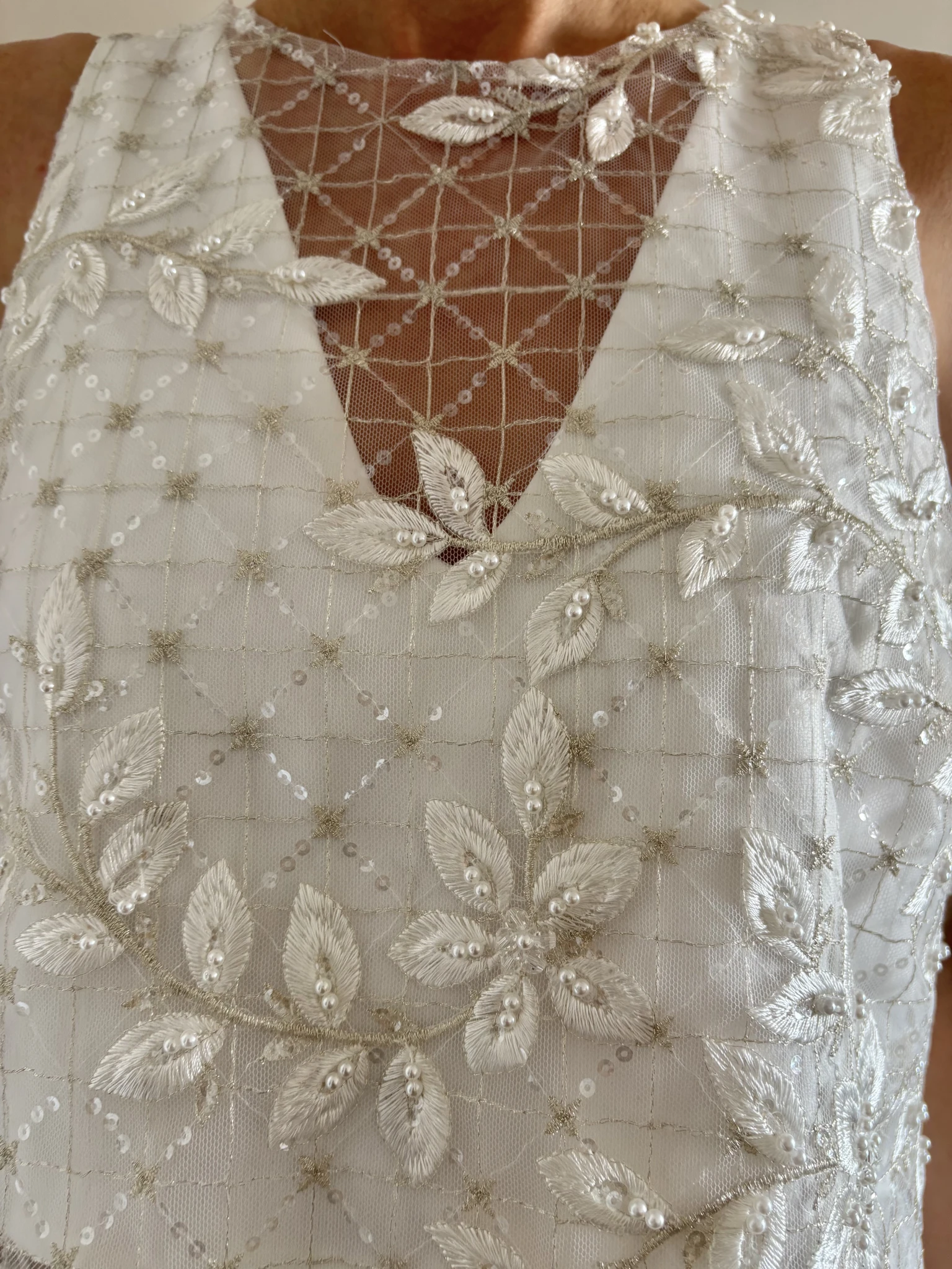 Cada flor, hoja y curva está cuidadosamente trabajada para generar volumen y brillo sutil a través de un mini paillettes cristal de fondo, las flores bordadas a mano en diversas piedras a tono, logrando un efecto visual refinado que se integra con delicadeza al fondo satinado.