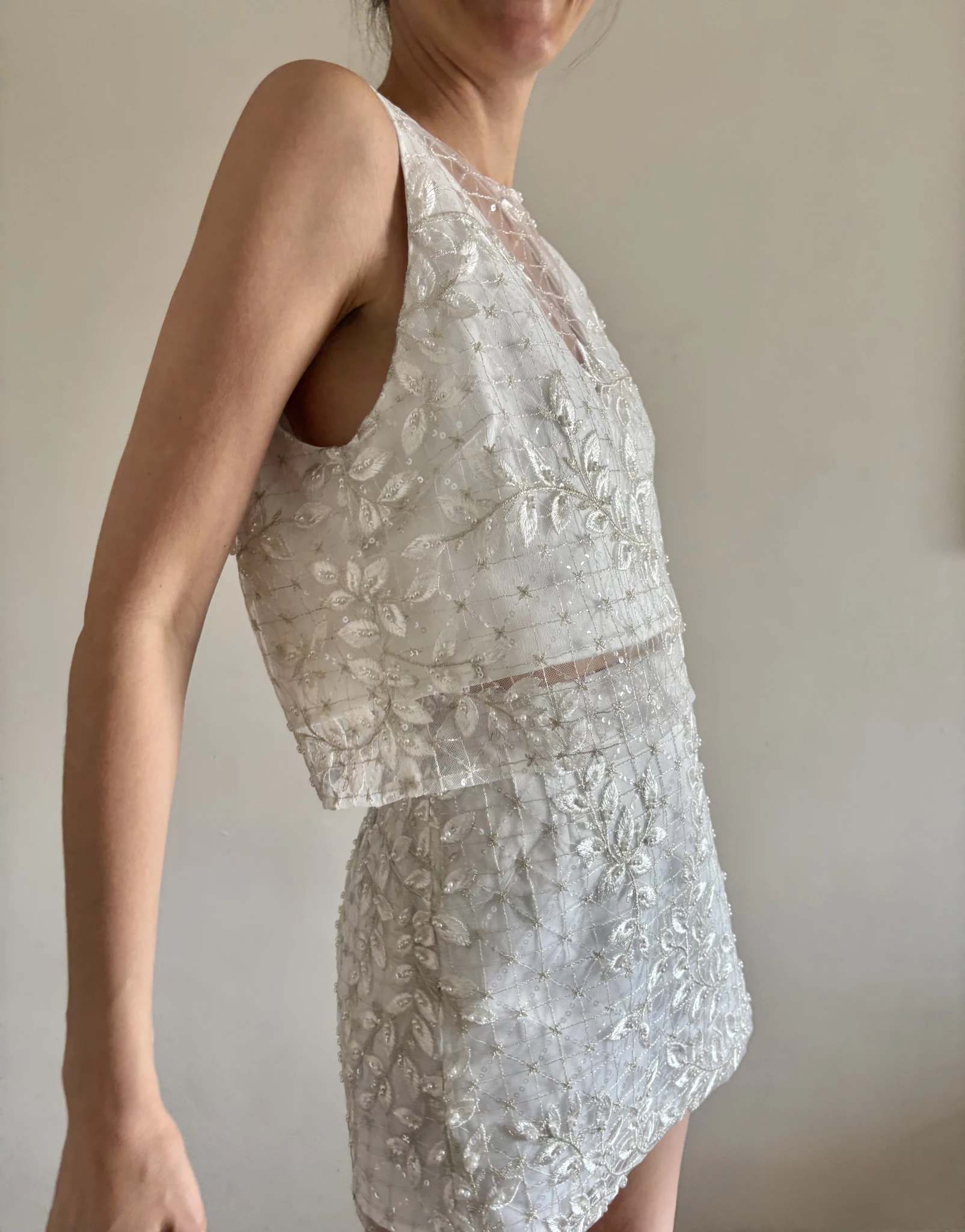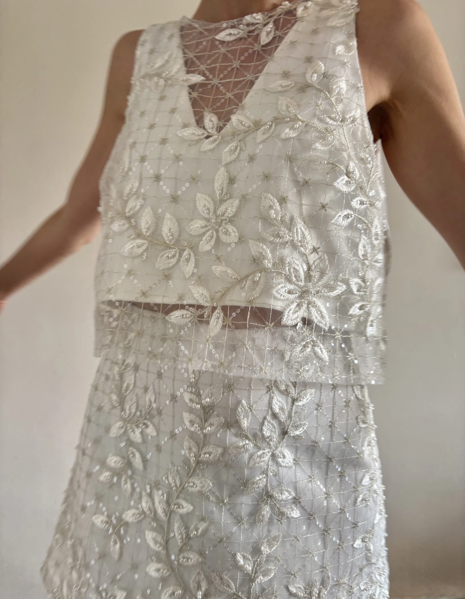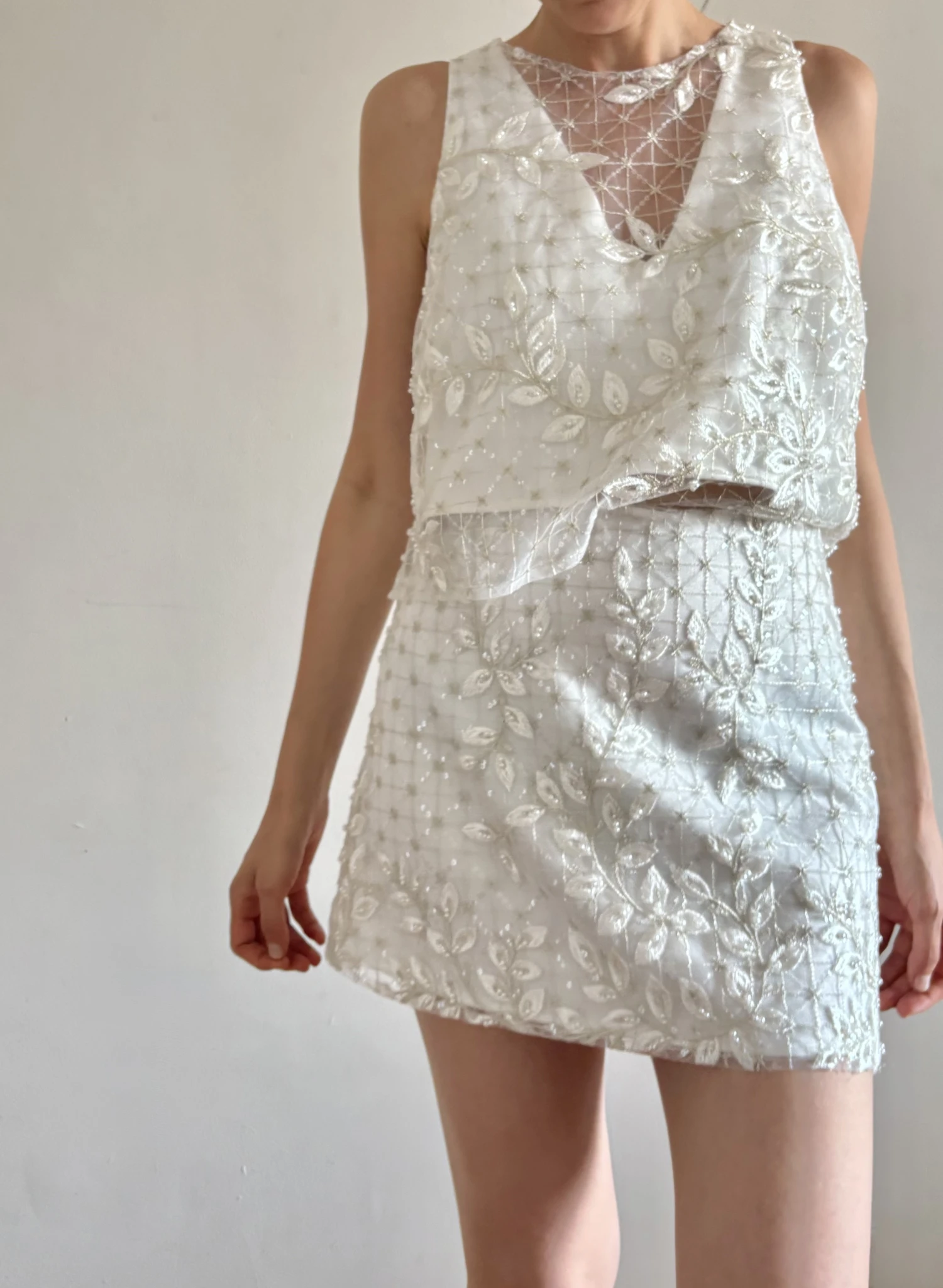 Conjunto de top y falda corto de espíritu moderno y morfología minimalista, realzado por un bordado en relieve, el trabajo textil se convierte en el verdadero protagonista: un tul bordado en hilo marfil, con motivos orgánicos que fluyen sobre toda la superficie de la prenda.