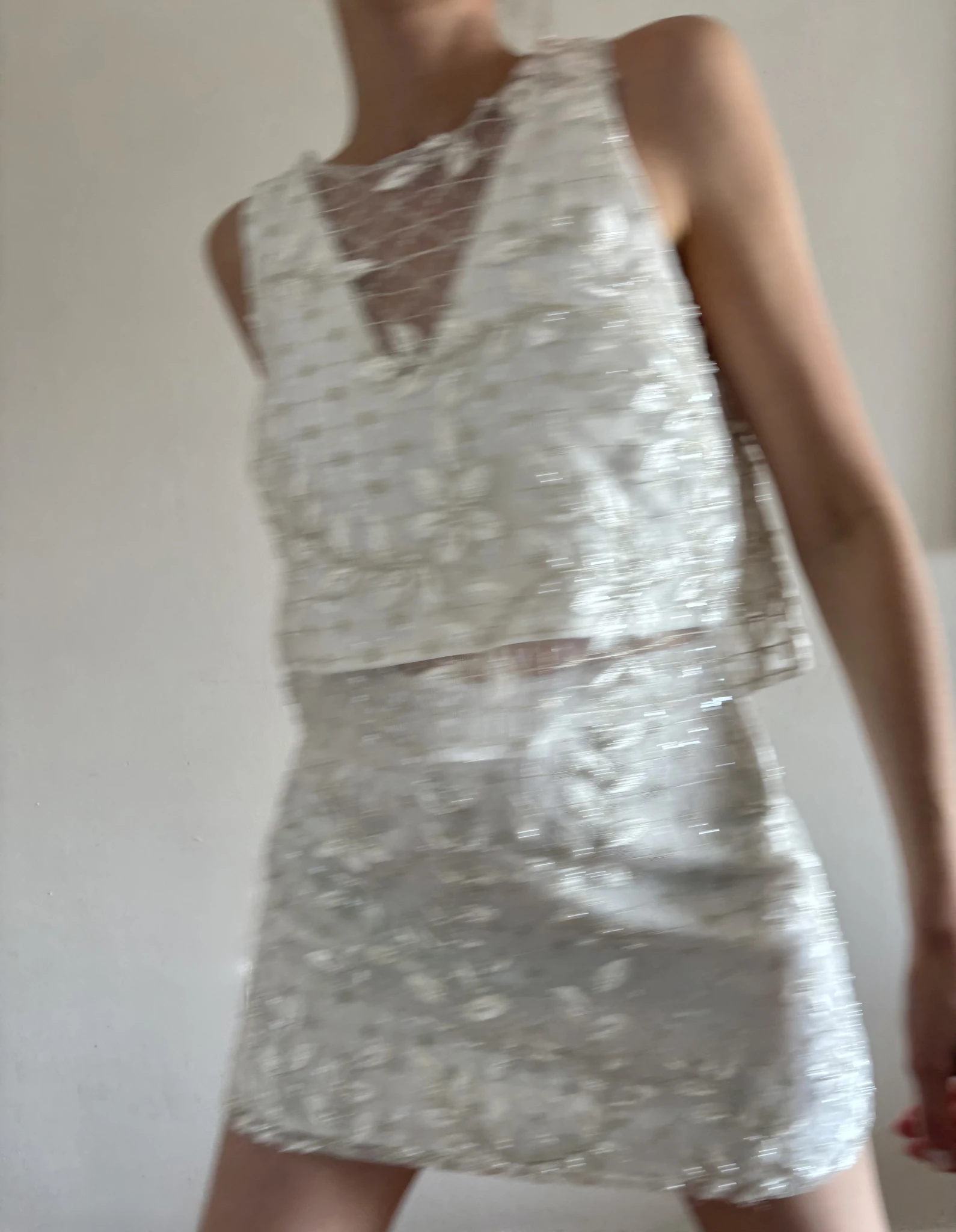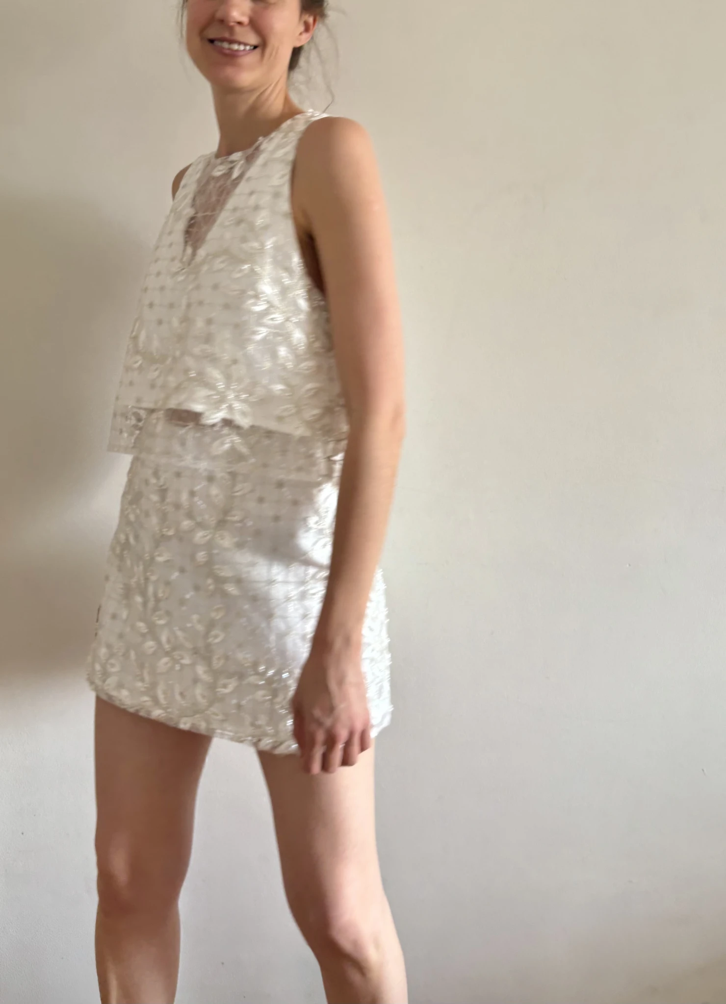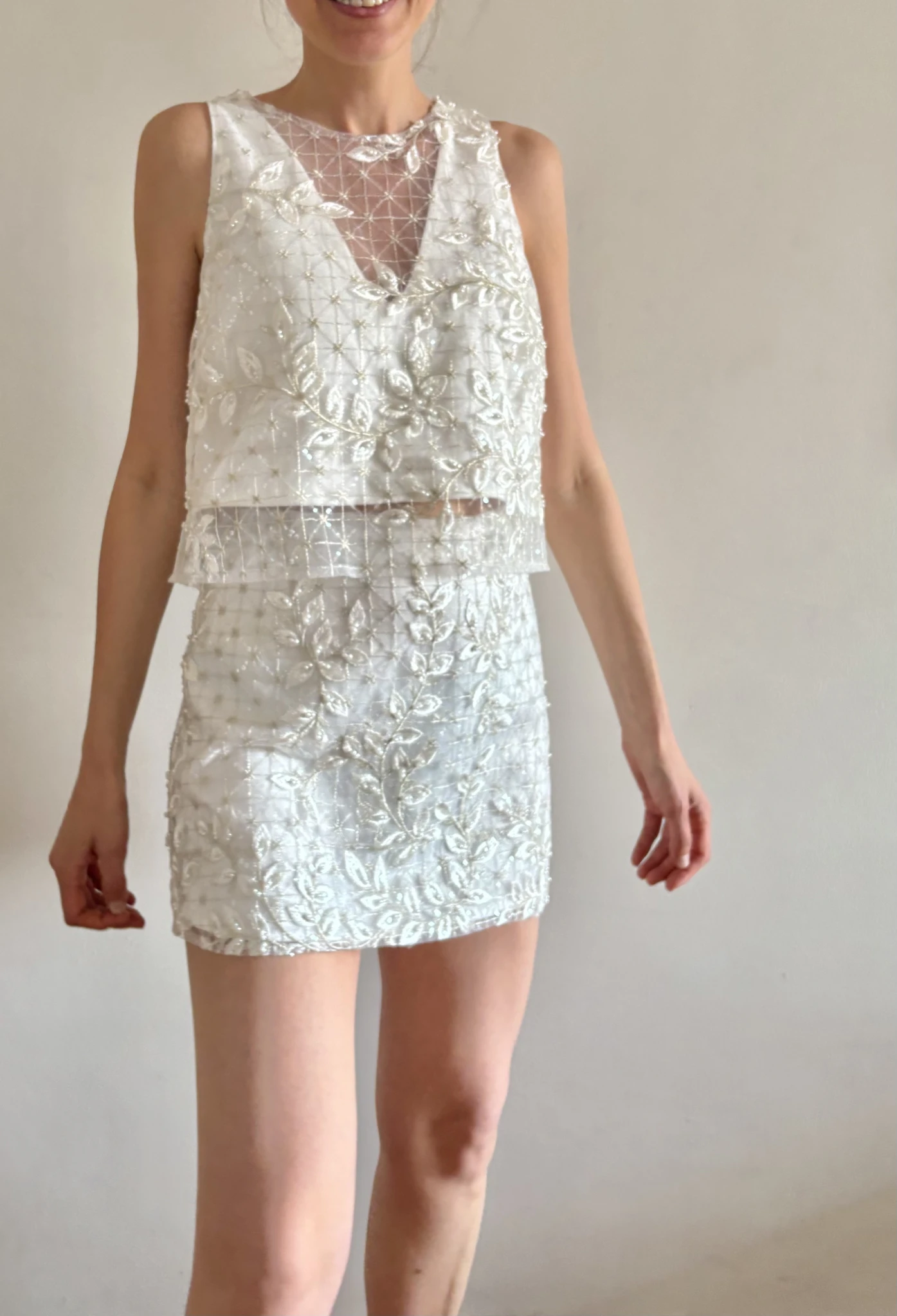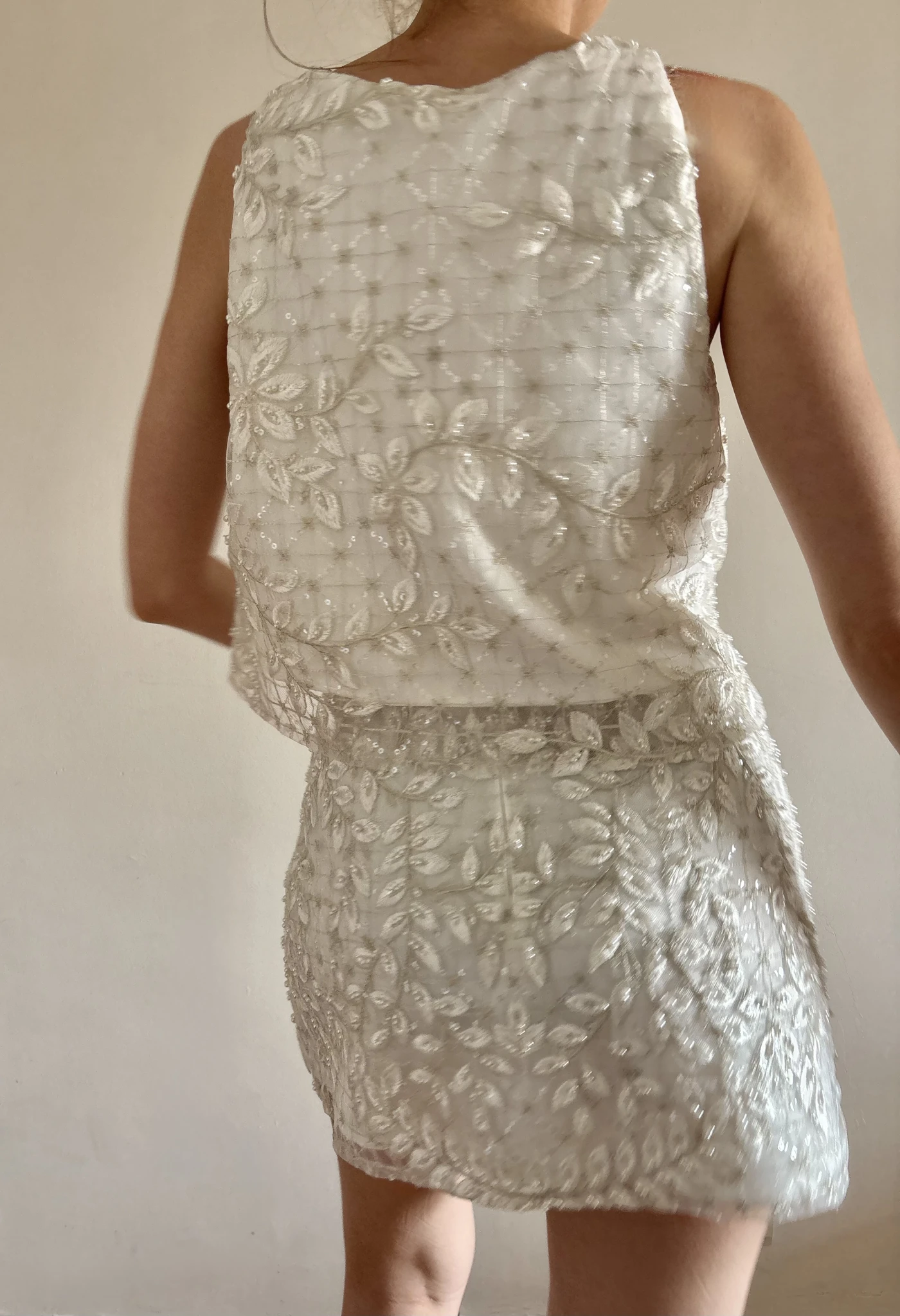 Conjunto de top y falda corto de espíritu moderno y morfología minimalista, realzado por un bordado en relieve, el trabajo textil se convierte en el verdadero protagonista: un tul bordado en hilo marfil, con motivos orgánicos que fluyen sobre toda la superficie de la prenda.