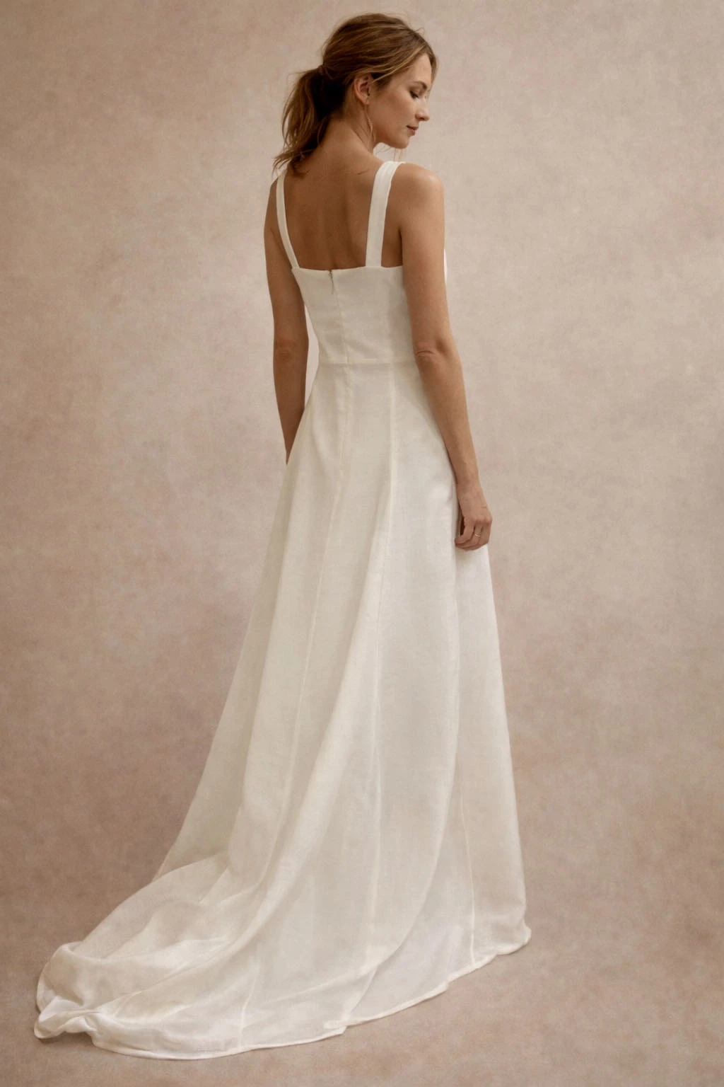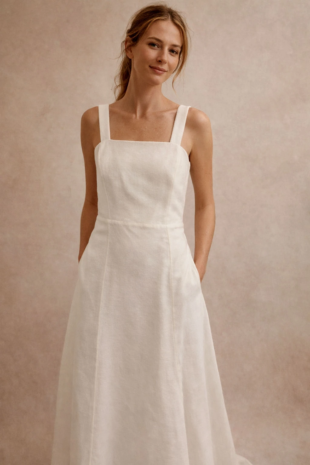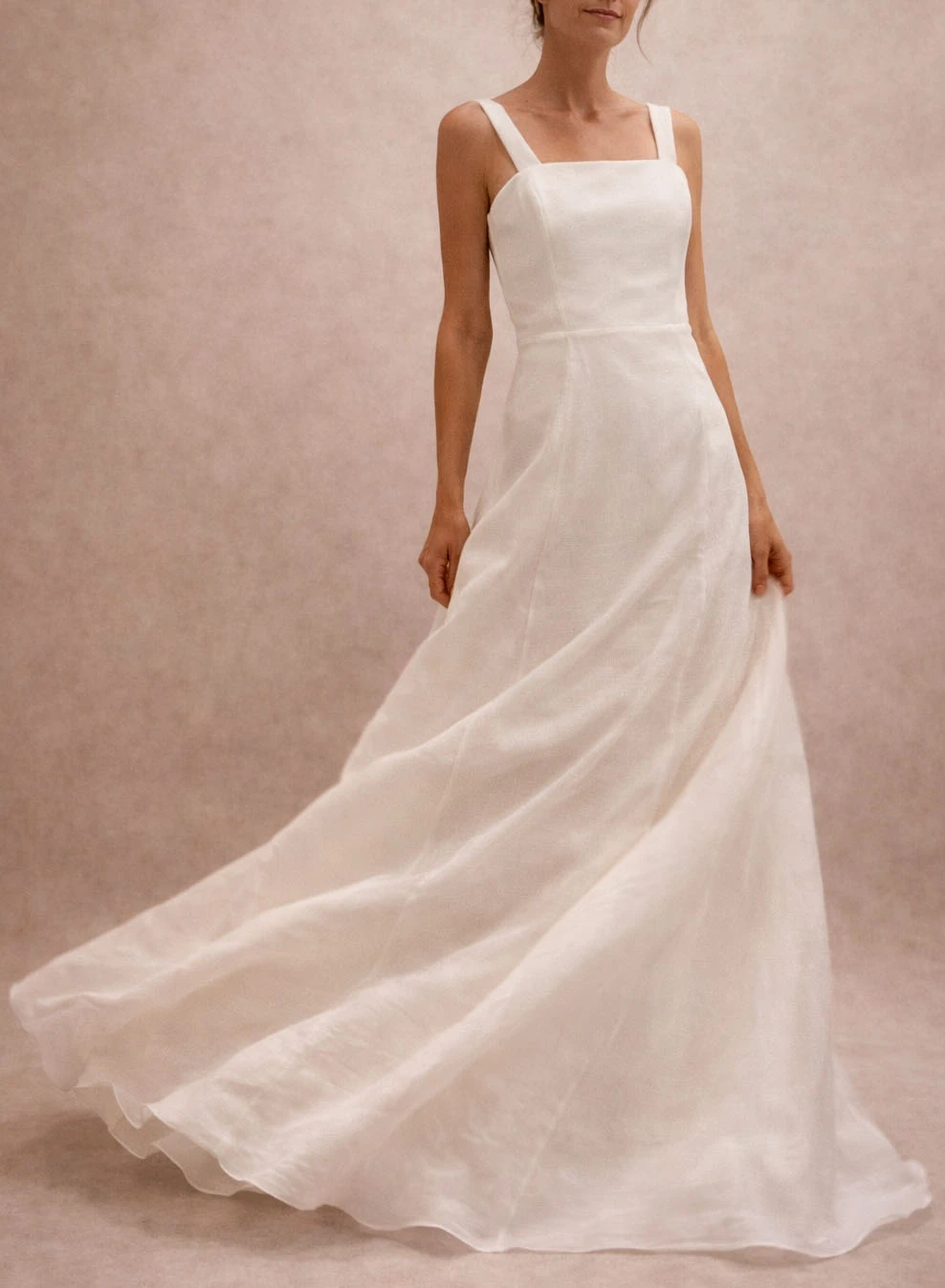 Vestido largo de líneas puras y silueta recta, con escote recto y breteles anchos que aportan sostén y una estética limpia y atemporal.